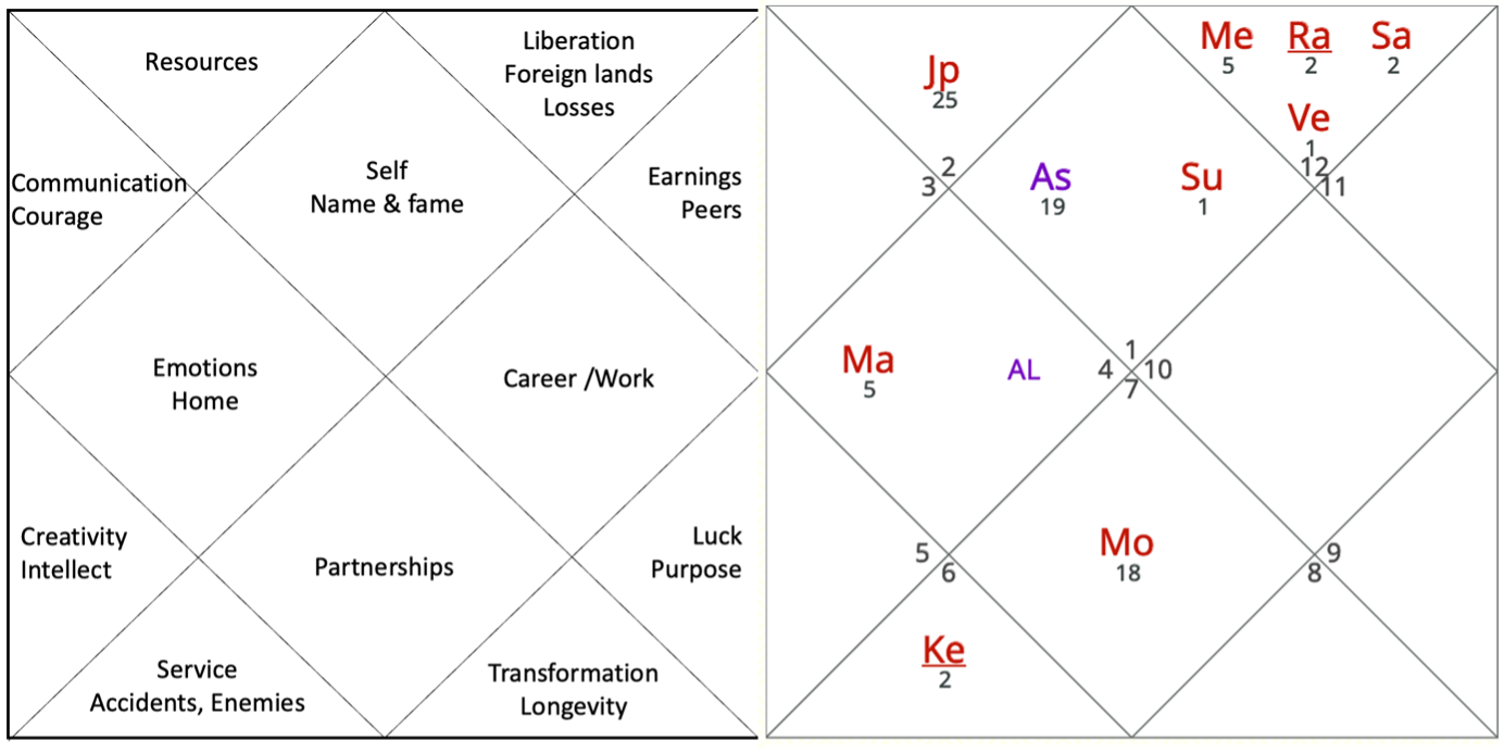 The fiery Aries is in the ascendant, its nature is adventurous and it represents the ignition of the fire and start of a new cycle – lift off! With the Sun exalted by its placement in Aries to show off.